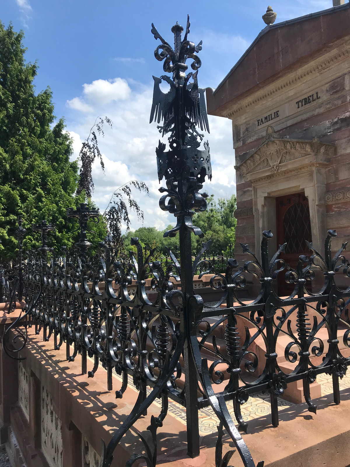 De vier zijden van het dak zijn voorzien van driehoekige frontons met akroteria in terra uitvoering, en een vaas midden op het fronton van de voorgevel, alsmede een kruis op de nokbalk in lichte kleurstelling. Op de frontons van de zijgevels zijn twee kruismotieven in reliëf geplaatst, op die van de voorgevel de woorden Grabstätte en Familie Tyrell op de fries. De ingangspartij bestaat uit een houten deur in een stenen omlijsting met sprongsgewijs verlopende bovendorpel; het driehoekig portaalfronton is rijk versierd met palmetten aan de bovenzijde.