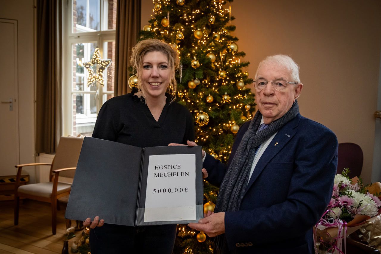 Op bijgaande foto overhandigt de inmiddels emeritus pastoor een cheque van 5000 € aan Kim Simons als vertegenwoordigster van het Hospice.