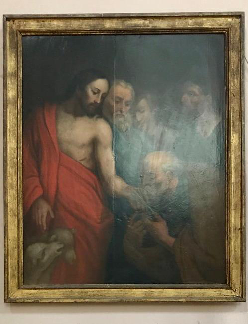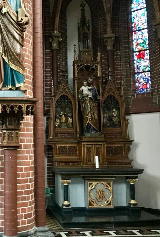 Het schilderij rechts aan de wand vóór het St. Joseph-altaar is van een onbekende meester, olieverf op paneel uit de zeventiende eeuw, Vlaamse School en laat zien hoe Christus de sleutels van het Rijk der Hemelen overhandigt aan Petrus.