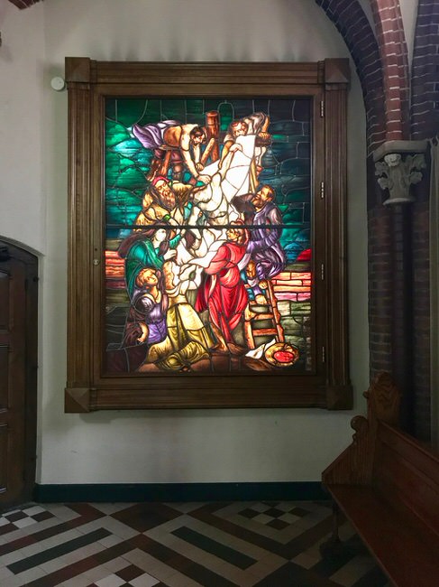 Achter in de kerk bij de opgang naar het oksaal het glas-in-lood-tableau: “De Kruisafneming van Christus”. Naar P. Rubens en geschilderd door de Vaalser kunstschilder Franz Griesenbrock en vervaardigd in atelier ‘Joelle d’Alsace’ te Lanaeken.