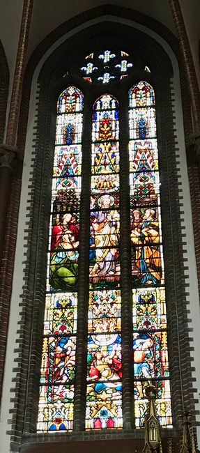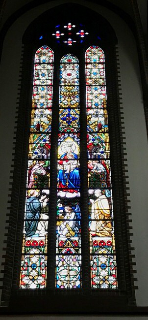 twee ramen werden geschonken door de dames Henriëtte en Pauline Tyrell en hun broer Heinrich (kosten 3000 Mark), ontworpen door G.J. Bentz en vervaardigd in de Königliche Bayerische Glasmalerei Zettler in München. Het derde - middelste – werd geschonken door een onbekende (1700 Mark). In 1901 werden de resterende twee ramen op het priesterkoor aangeschaft uit giften van de parochianen.