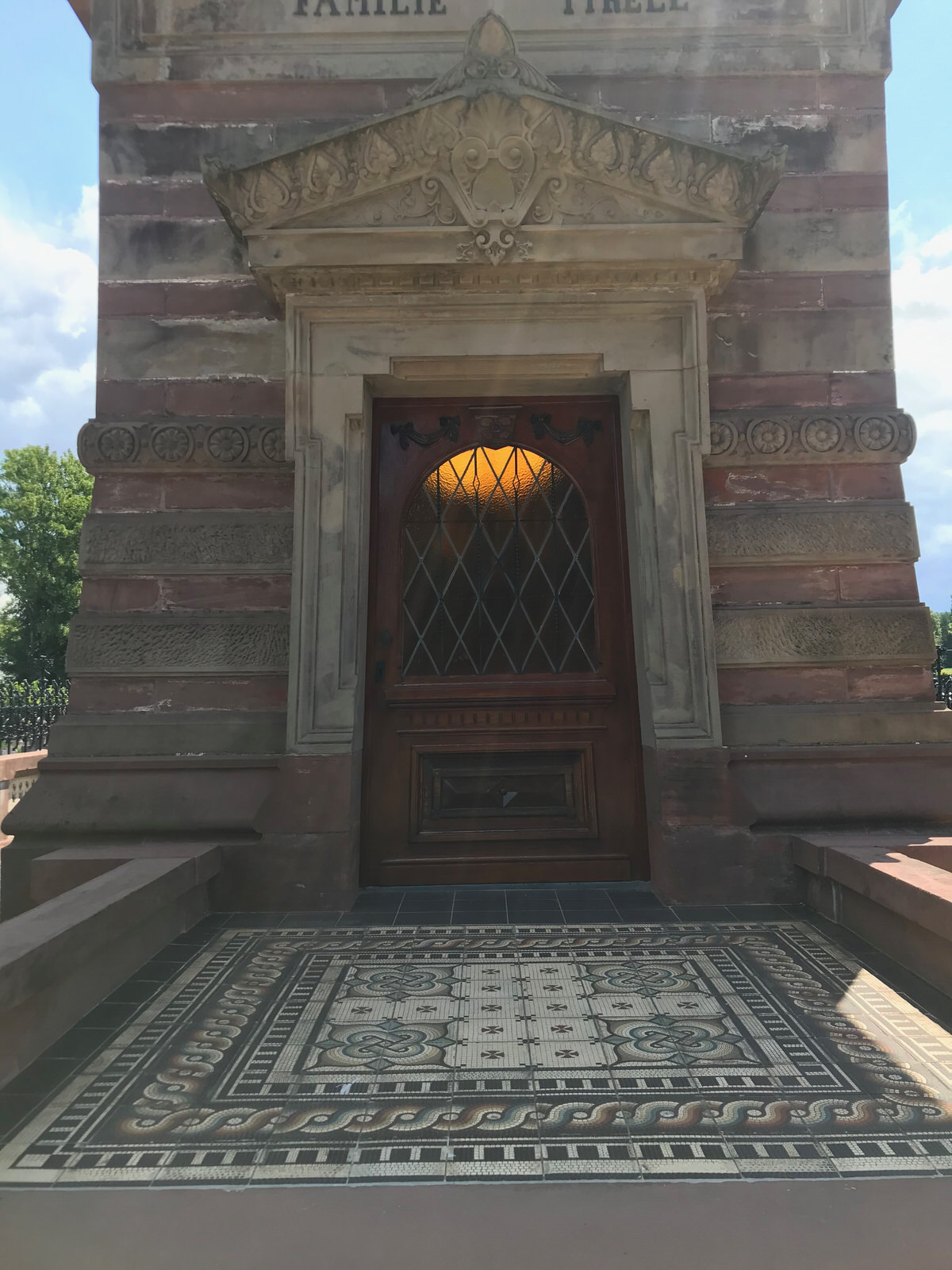 De vier zijden van het dak zijn voorzien van driehoekige frontons met akroteria in terra uitvoering, en een vaas midden op het fronton van de voorgevel, alsmede een kruis op de nokbalk in lichte kleurstelling. Op de frontons van de zijgevels zijn twee kruismotieven in reliëf geplaatst, op die van de voorgevel de woorden Grabstätte en Familie Tyrell op de fries. De ingangspartij bestaat uit een houten deur in een stenen omlijsting met sprongsgewijs verlopende bovendorpel; het driehoekig portaalfronton is rijk versierd met palmetten aan de bovenzijde.