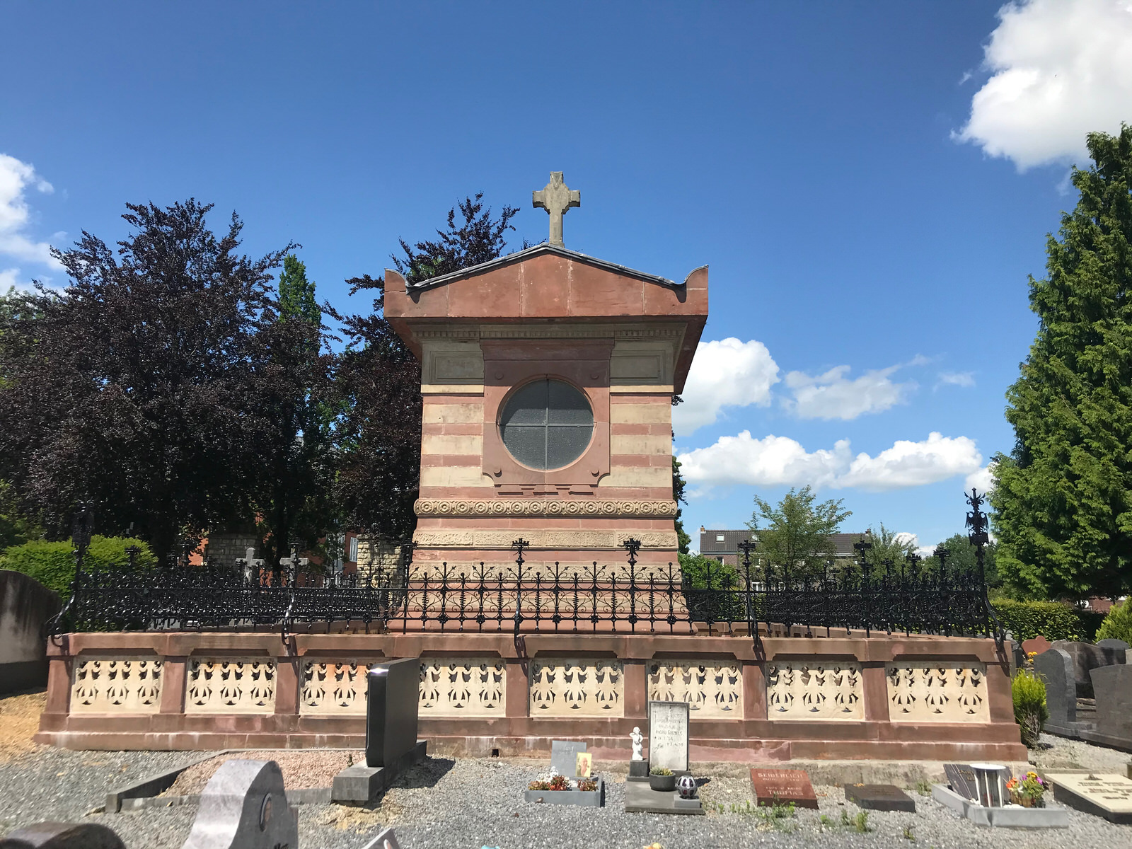 Het venster aan de achterzijde bezit twee haaks geplaatste roeden en is gevat in een rechthoekige terra omlijsting met drie series guttae aan de onderzijde. Achter de kapel bevindt zich de eigenlijke grafkelder, afgedekt met twee luiken. De verhoging waarop de kapel is geplaatst, is met veelkleurige tegels bedekt en omheind door een kunstig gesmeed hekwerk met bijzondere hoekversieringen; de verhoging zelf is onder dit hek gevat in een raamwerk van geajoureerde steen. Neo-classicistische grafkapel in markante vormgeving en met verzorgde detaillering van belang wegens architectuurhistorische en cultuurhistorische waarde.