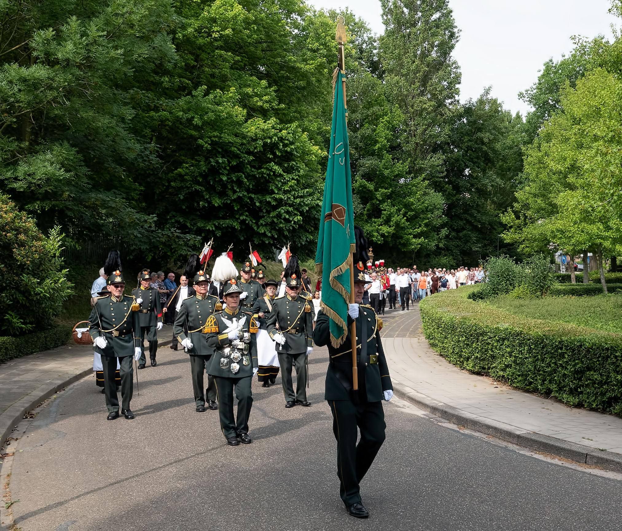 Op zondag 9 juni trok traditiegetrouw de processie uit in Vaals. Ofschoon ik niet zelf het heilig Sacrament kon dragen, ben ik zeer onder de indruk van deze geloofsuiting, die ook met veel; folklore gepaard gaat. Maar dat is niet erg, want een mens gelooft niet alleen met zijn hoofd en verstand, maar vooral met zijn hart en zijn gevoel. Bij een processie horen daarom de processiemarsen van de harmonie, het tromgeroffel van de drumband, het sonore gezang van het koor en tenslotte zijn er ook de communicantjes, die met hun belletjes op de aanwezigheid van het H. Sacrament opmerkzaam maakten. Die belletjes waren lieflijk. Daarentegen bij de zegen weerklonk er schutterijgeknal, als een vervanging van feestelijk vuurwerk. Dat was even schrikken.