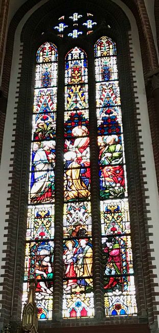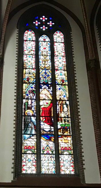 twee ramen werden geschonken door de dames Henriëtte en Pauline Tyrell en hun broer Heinrich (kosten 3000 Mark), ontworpen door G.J. Bentz en vervaardigd in de Königliche Bayerische Glasmalerei Zettler in München. Het derde - middelste – werd geschonken door een onbekende (1700 Mark). In 1901 werden de resterende twee ramen op het priesterkoor aangeschaft uit giften van de parochianen.